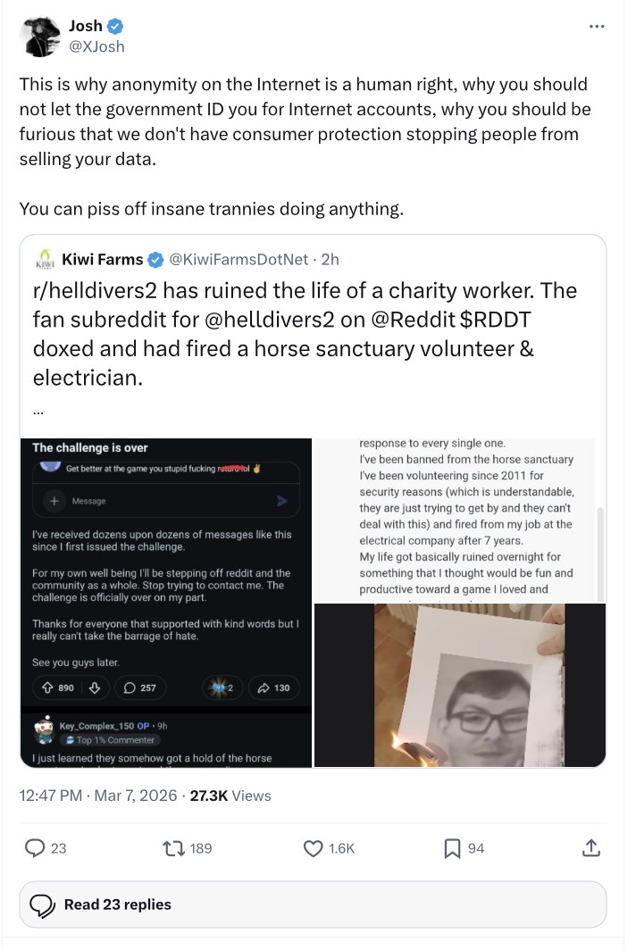 But, you know, I don't paint a target on my back and IRL identity for that exact reason. It's almost like, if li'l J-man is scared of estrogen zombies, he should hit the gym, buy a gun, and maybe not tell people where he lives. Motherfucker lives in Florida last I checked, it's not exactly hard to get a nice piece and a concealed carry permit there. You wanna be controversial publicly, you gotta deal with shit. Don't cry about the consequences when they were easy to see coming.