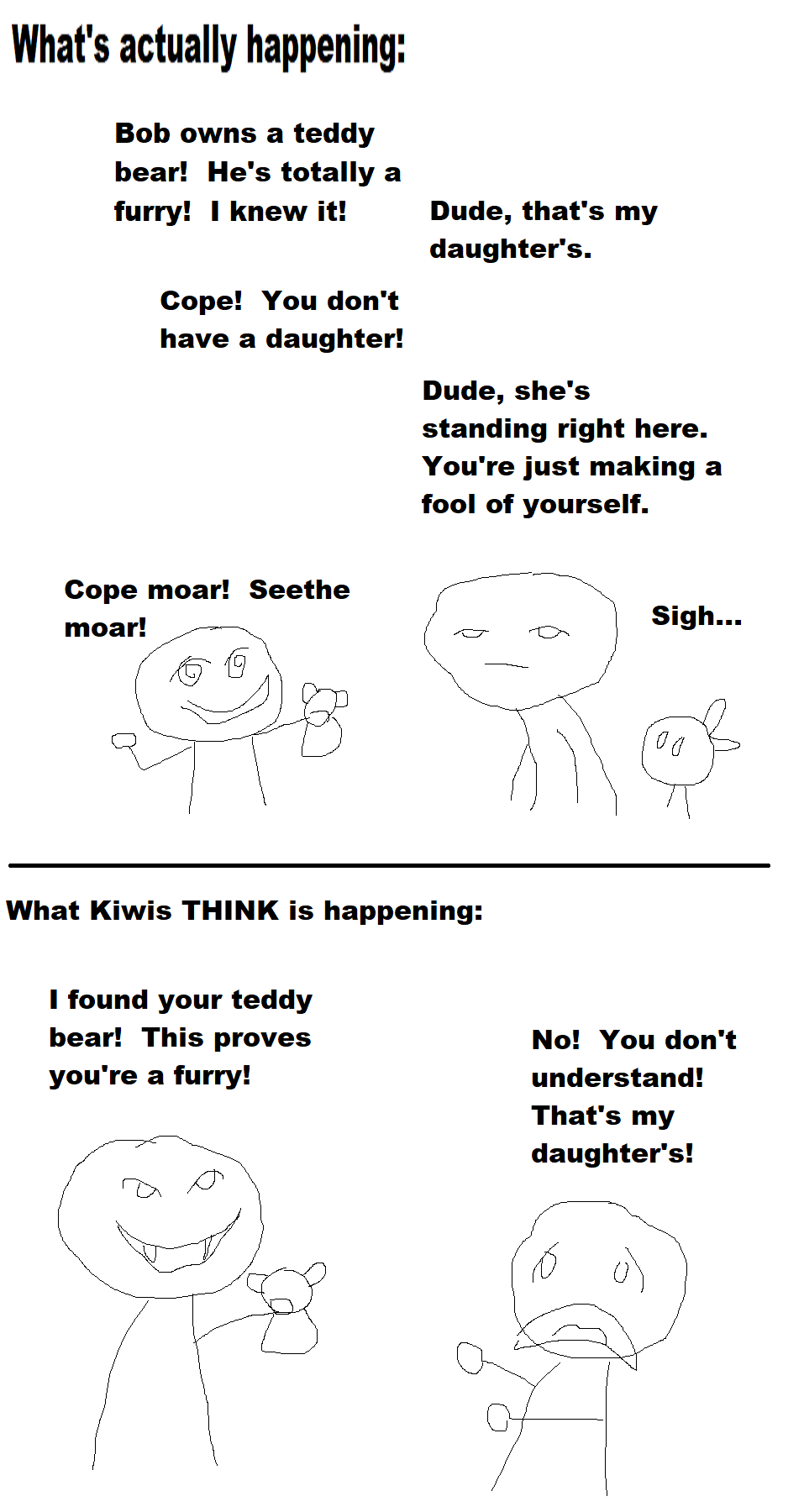 I was having trouble sleeping and wound up reading some TV Tropes articles until my eyes drooped, and it just occured to me "hey, you could probably assemble a thing like this, but for common features of Kiwifarms users." Maybe an actual Kiwi will read this and finally gain some enlightenment, as well (we can only hope).