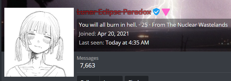 how do you know @BittersweetSymphony is lunar?I'm not a big fan of Lunar Eclipse Paradox (AKA @BittersweetSymphony), this guy is known for drawing little girls in bondage gear with their arms cut off. Absolute freak behavior. On top of that, he’s used self-harm as a means of manipulating people to stop making fun of him. Dude is genuinely unhinged.
