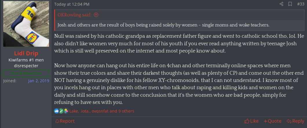 Lidl got active on KF after I was already banned, I never went back to KF so I have no idea what's going on there or who the most prominent accounts are. From what I've read here, Lidl is only active in the thread he started, the Man Hate thread, and he's active in the MATI thread, where he actually gets downvoted rather regularly for his bad takes. I would hardly call someone being active in just two threads "pre-eminent".There is no more pre-eminent "woman" account on KF than Lidl Drip.