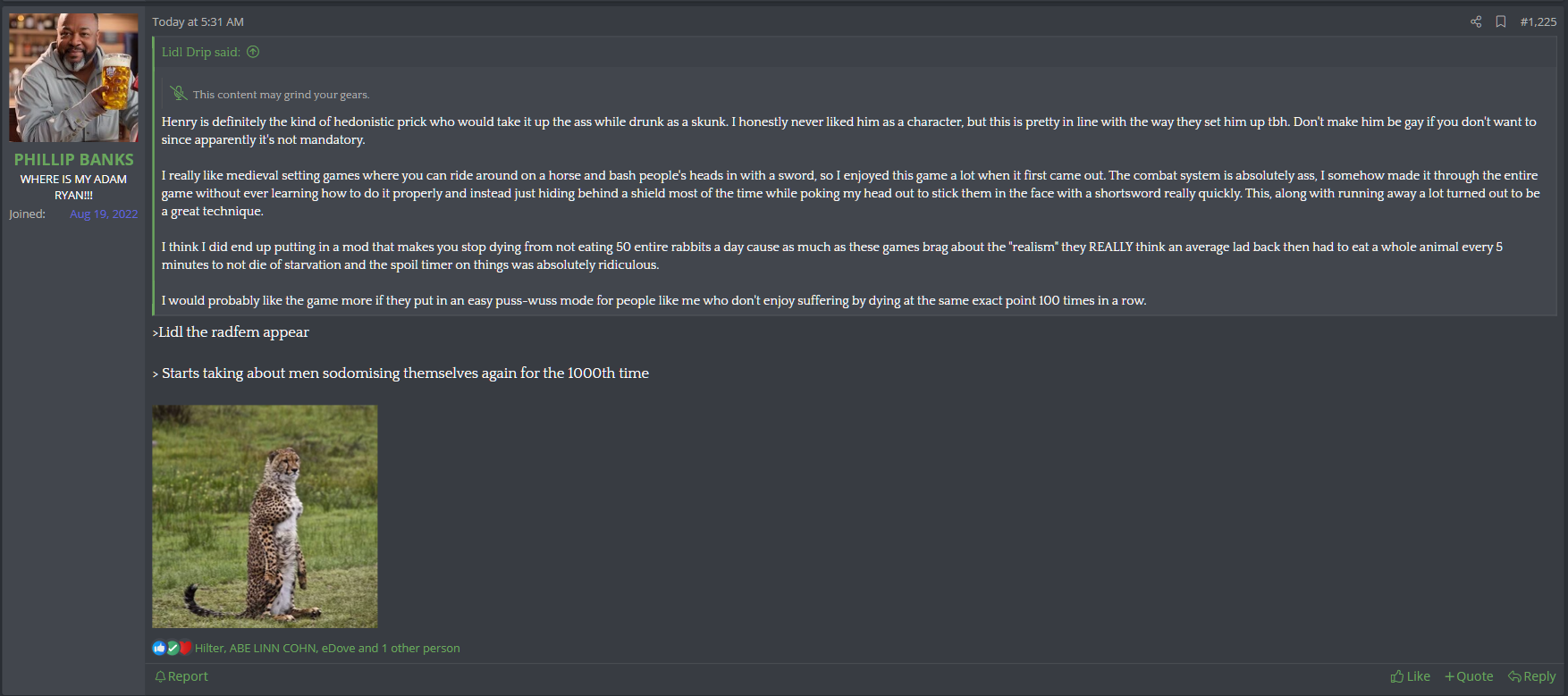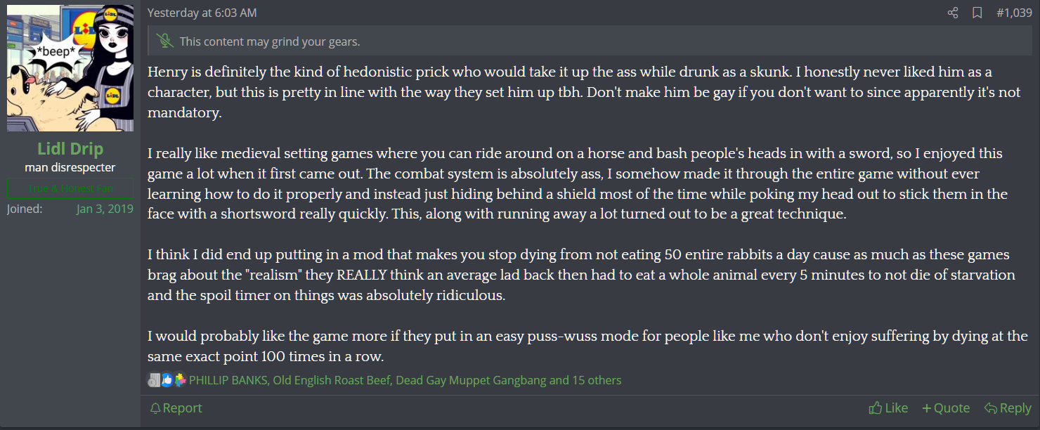 Like the game more, don't they hate video games, whining about men vidyaing rather than doing everything for them?Lidl went to the Kingdom Come Deliverance thread to spread faggy bullshit about the protagonist (who apparently is exclusively straight in the first game) and got negrated, and that last line is very Null-ish.