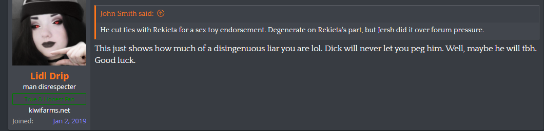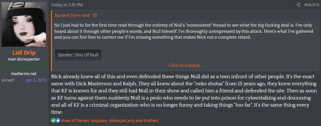 I insist that Null very likely already knows that Lidl is a man, and that Null is deliberately enabling Lidl's tradthot-LARP because Null wants to introduce the TERFs on KF to racism and far right politics through Lidl's Man Hate thread.