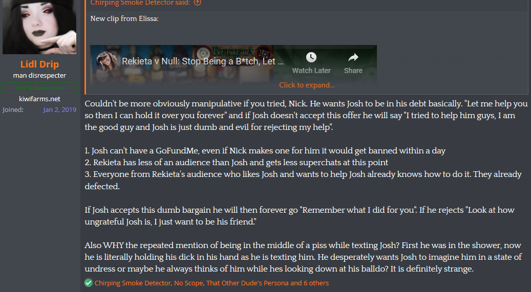 Remember, Null once did a whole thread on KF where he tried to convince all the TERF cat ladies that they really do want to have children and are just repressing their natural urges, and they all told him to just fuck off. Null knows that he, as a man, has no control or influence over all these women on KF... but a Null-clone pretending to be a woman might still be able to manipulate them in his place. That's what I suspect the end game of this whole LARP is.