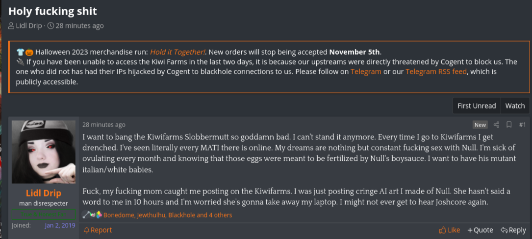 The reason I believe Lidl Drip is Dyn dates back to the 2019 Kiwifarms leak. Dyn did eventually leave over it, around February as far as I can tell. He would not publicly rejoin Kiwifarms until October of that year, but February sounds a bit familiar, doesn't it?