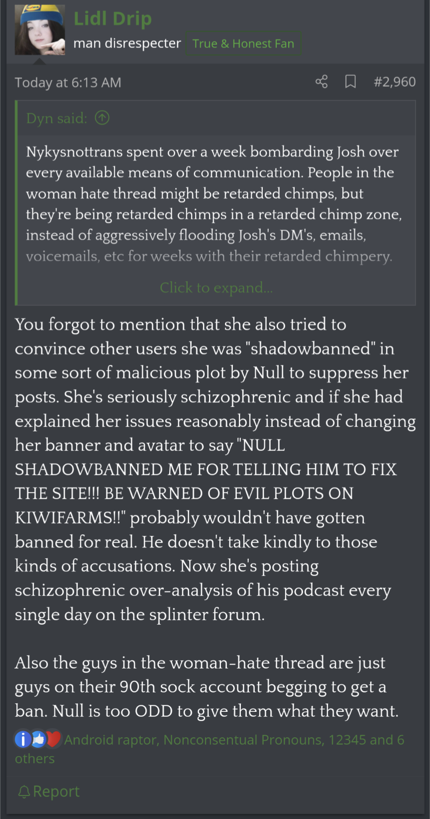 Now Lidl Drip made the Man Hate thread and has been successful in starting this retarded civil war in Kiwi Farms and somehow has Null wrapped around his greasy clutches. How Lidl drip has been manipulating Null is a huge mystery to me but I guess Null is that much of a simp. He must have given Null "convincing" evidence that he's actually a woman and Null fell for it.