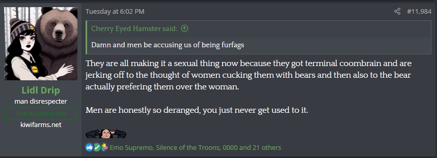 Seeing as all men here are from there, this implies that we all also have rapist vibesShe loves that Kiwi Farms is filled with guys who all have rapist vibes