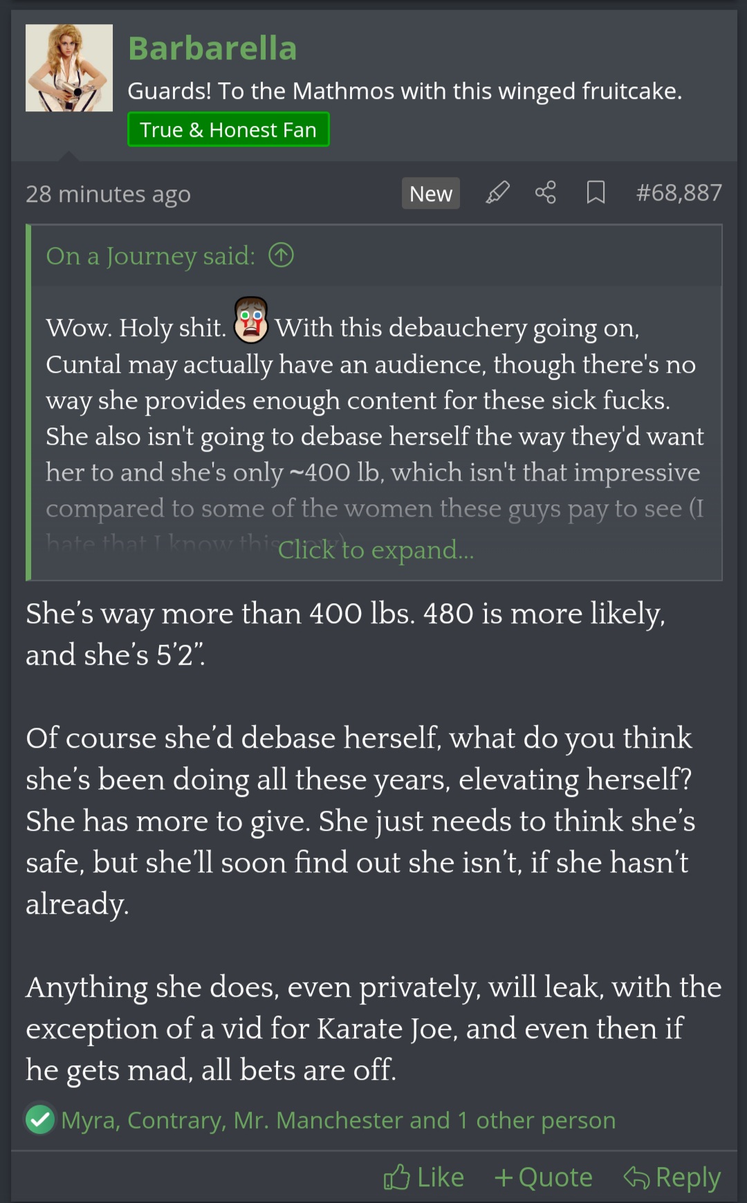I don't get it, what's suspicious about these posts? Her knowledge of lip filler blowouts and seeming ability to eyeball landwhale weights? Or just that she's not immediately powerleveling like most of BP, so whatever she's holding back must be juicy?