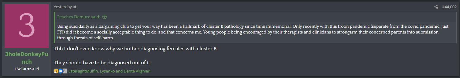 Reading is hard. They're saying that all women have cluster B disorders and they should have to be tested to prove that they don't. Pretty based and true, ngl.females can't be Cluster B"