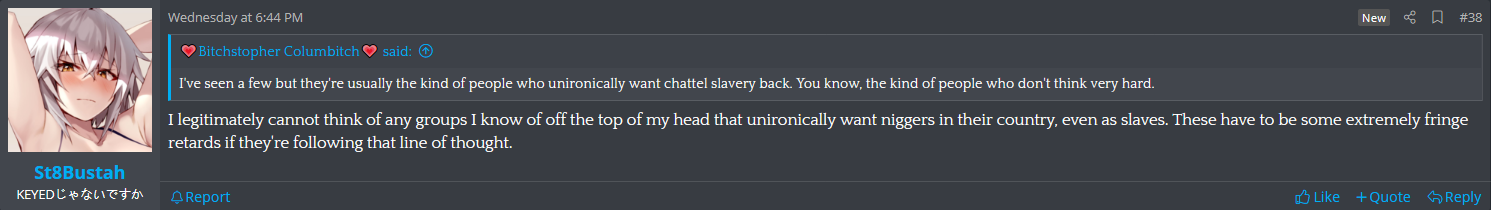 If they're out of high school I doubt they've reached twenty yet. This is what happens when all your views are defined by the online community you participate in.Odds on this fine, upstanding young fascist weeb coomer having a job IRL? Even before the pandemic, I mean.