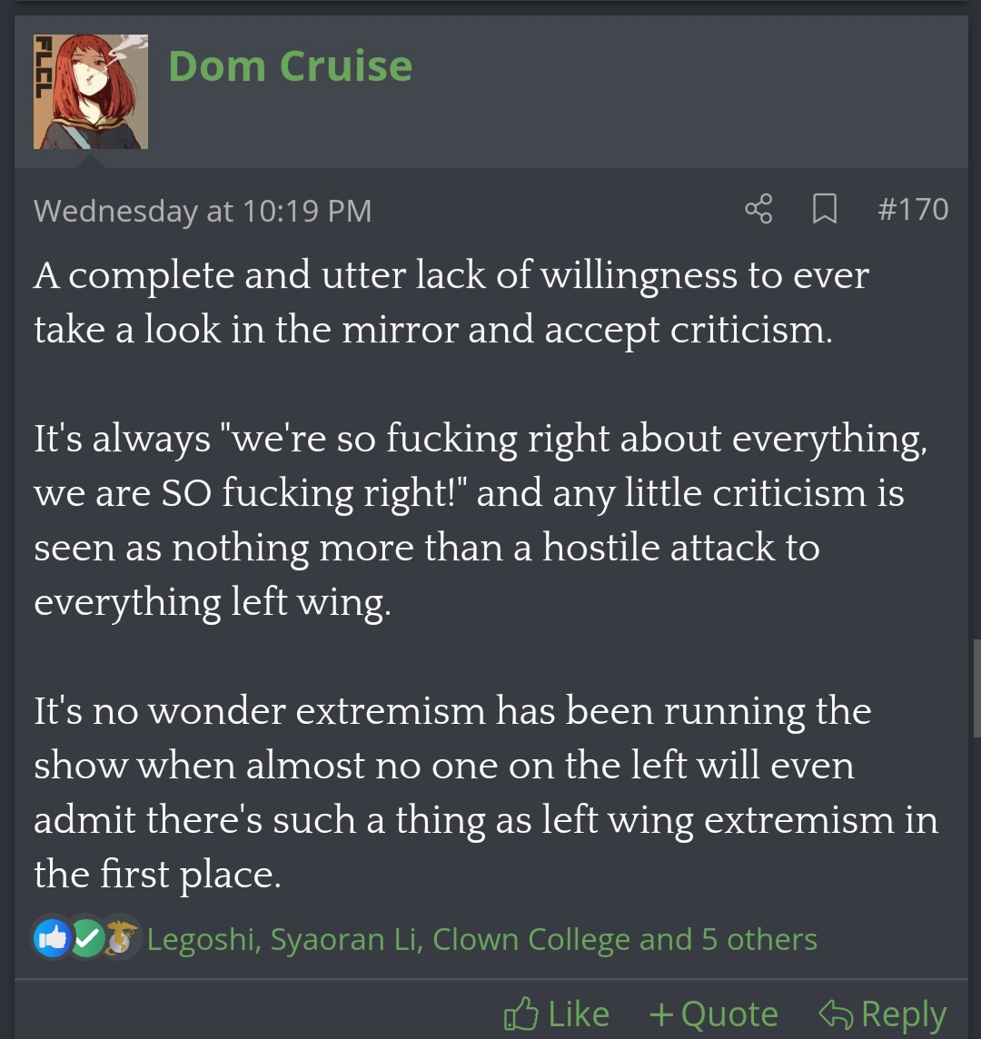 Most of those guys just blend together for me. The only ones that really stick out to me are BoxerShorts and CaesarCzech for their insanity and writing styles.Glad you guys finally started talking about Dom Cruise because the first I've seen of him was doomposting in the Floyd thread till people told him to shut up, only for him to start preaching to the choir so he can keep getting those sweet stickers