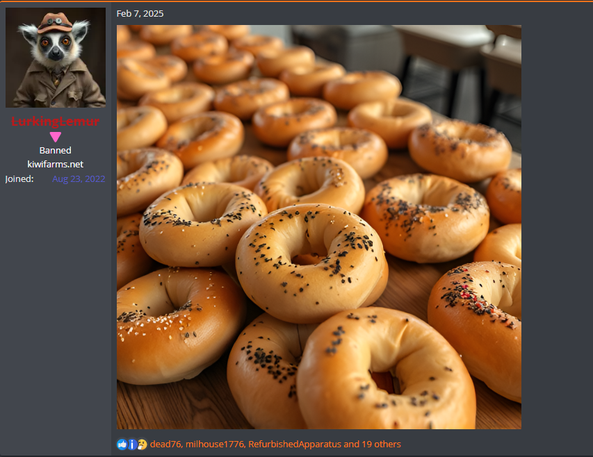 Lemur posts about bagels a lot and probably fucks them during his free time if I had to guess: