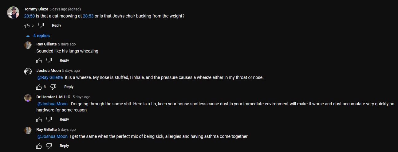 Exactly! If it was Null making those cat sounds due to being sick, why were they only audible during that particular short segment? Why wasn't he making cat sounds throughout the whole episode, and why wasn't he making cat sounds in this week's episode as well, since he's even more sick than last time? Do these people ever hear themselves to notice how plainly illogical they sound when they try to gaslight about this?Josh was audibly more sick this recent MATI than the previous one, but there were ZERO cat sounds