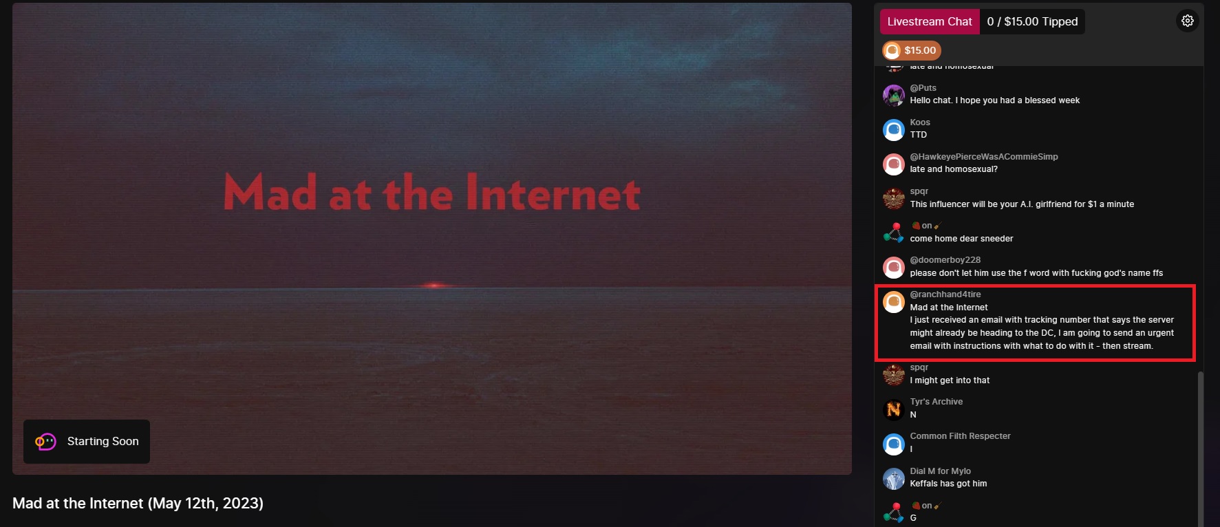 what a great website , you would think the owner would have a stable chatThe DDoSer appears to attack Josh during stream because Josh has made it clear over the past few weeks that he does zero prep, downloading videos and screenshotting posts, and does everything live which has led to problems of his site not loading and needing to wait along with asking sneedchat live for links to things he's missed.
