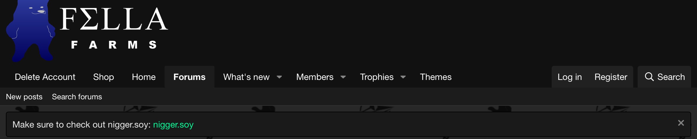 There's also Fellas Farms, the splinter I was referring to. Fellasfarms has Cloudflare DDoS protection and formerly revived one of bu5t's imageboards, by the name of nigger.soy. Nigger.soy is dead.