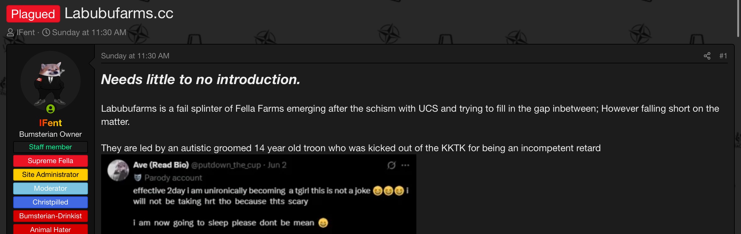 JKLfarms is not a splinter of SF, but rather a site mocking it and making fun of it. Labubufarmers are trying to raid it.