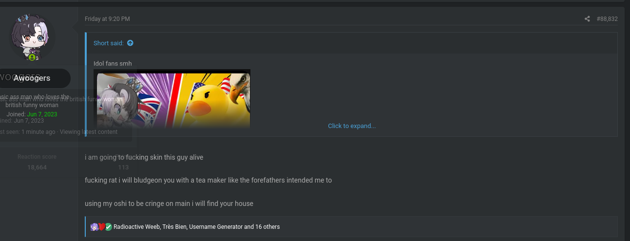 yes. Im fine, The info they got was wrong, but even still all they got was my "name" only first and last. They never got a location, they never got anything else. dont worry about me. its still fucked up to doxx a child or attempt to. but you cant argue with people like that. It’s impossible to talk sense into people like that. I did recieve some messages in my discord dms, mainly empty threats, one of the guys who spammed it was named awoogeers. hes 28 and obessed with a britsh vtuber(the real reason why he went out of her way to threaten me, and though he will never admit it is because I made a video talking about rin penrose which is his idol or something, in which I made fun of rin penrose for saying that being a vtuber is harder than a 9/5. he got so mad at that which is why its one of the first things he posted about, and I know he rage watched the entire video in its entirety. That is the real reason why awoogers decided to dm my inbox with the "dox".) I dont listen to what people like that say about me.
