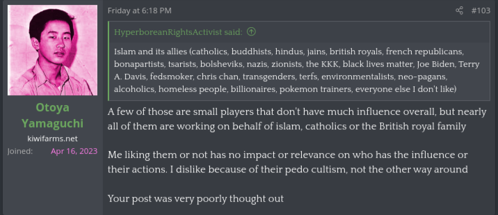 notice how people stop taking this sped seriously and proceed to troll his spergy ass. after that, people in that thread just stop responding to himTIL: Everything bad in the world is bc of Catholics, Muslims and the British Royal Family.