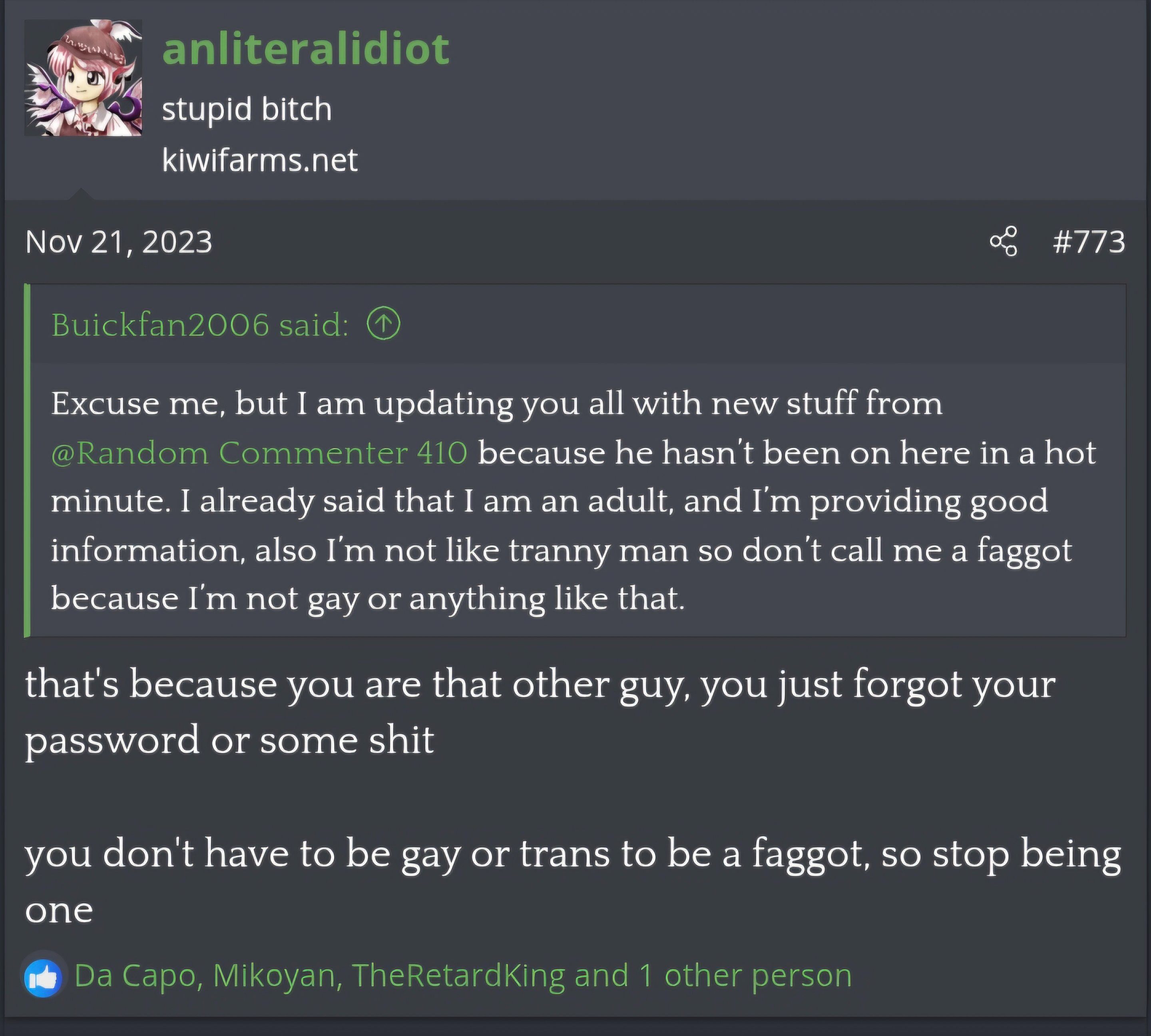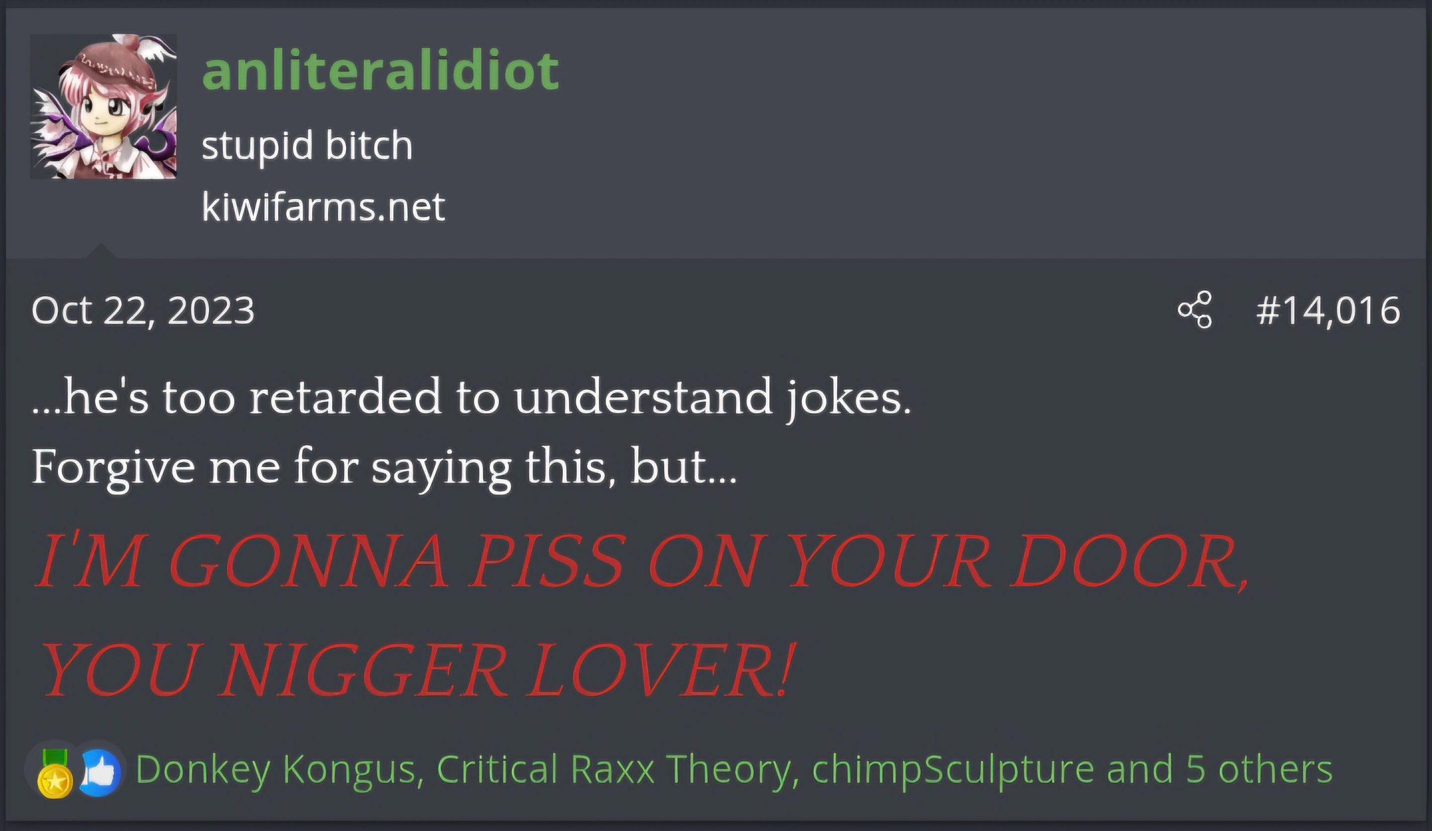 The full logs of the Goblin Hole Discord Server in JSON where anliteralidiot was labelled as a known bad actor(lol) and chased out of the server. The server is also host to a great deal of Cyraxx content and at one time hosted a bit of misinformation on me that anliteralidiot and @Earl of Slander tried and failed to push which was removed but you can see the post of them calling out anliteralidiot's jessleepez account when it was there