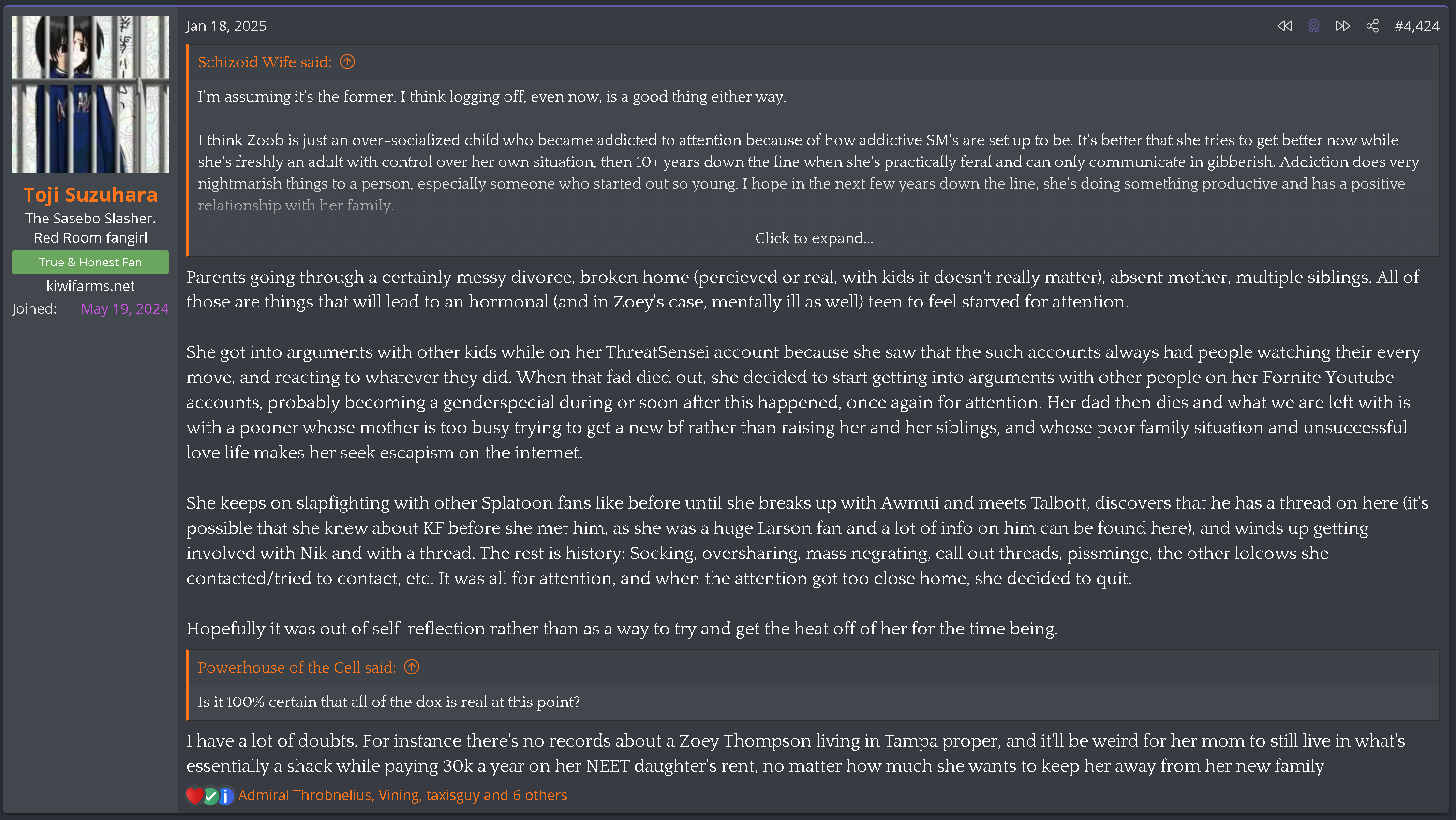 Wasn't Bear Hammee alleging Toji Grooming Zoey (Zoeynigger) enough proof? I mean why would he have said that. I'm pretty sure her thread was locked too for reasons beyond that.
