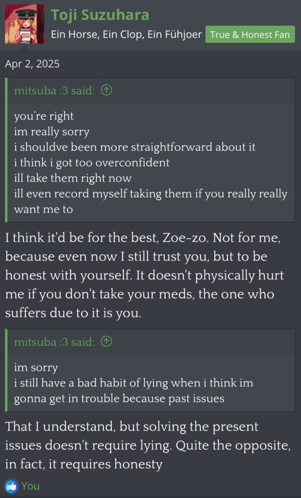 i dont have many screenshots of our interactions because my account is banned. HOWEVER. i did save this screenshot of him encouraging me to film myself taking my meds. i do wanna say i was the one who proposed this idea However the way he was talking to me beforehand made me feel like i was being punished. i know this is a silly way of thinking but please understand that i am mentally ill with an extensive trauma history and have diagnosed developmental delays so i do not always process things the way normal people do... not an excuse either just trying to explain to people who dont know me why i acted the way i did