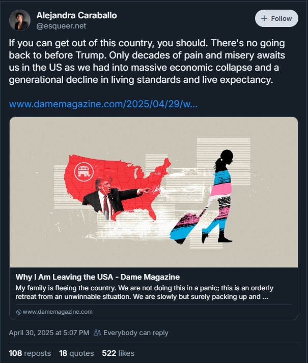 BTW, this is why Caraballo himself won't leave the US despite urging everyone else to. Alejandro knows that, even if troons can't join the military under Trump, there is literally no other country in the world where an radical far-left extremist troon like himself is allowed to join an elite university like Harvard while endlessly posting far-left Stochastic terrorism on Bsky, and still getting paid $90k a year for it. Only in the US does a troon like Caraballo have it this good. If Caraballo truly believed all the catastrophizing he's posting daily on Bsky, he would've left the US long ago. But the fact is that life is really good for Caraballo in the good ole US of A, so he says. But Cluster B troons are never grateful for what they have, they're just greedy for more power over non-consenting others because that's the essence of their sick kink, forcing their kink onto non-consenting others.