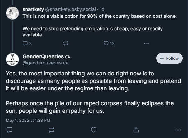 Yes, the most important thing we can do right now is to discourage as many people as possible from leaving and pretend it will be easier under the regime than leaving. Perhaps once the pile of our raped corpses finally eclipses the sun, people will gain empathy for us.bsky.app