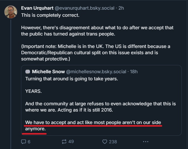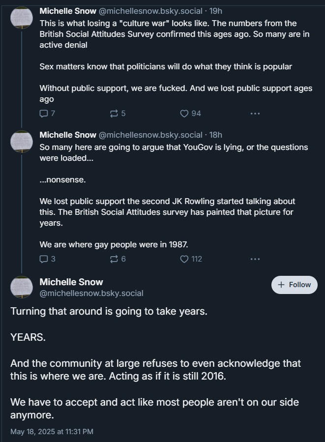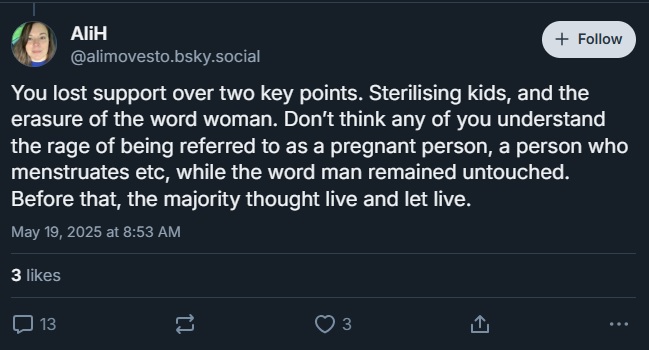 The only TERF presently on Bsky responds: "You lost support over two key points. Sterilising kids, and the erasure of the word woman. Don’t think any of you understand the rage of being referred to as a pregnant person, a person who menstruates etc, while the word man remained untouched. Before that, the majority thought live and let live."