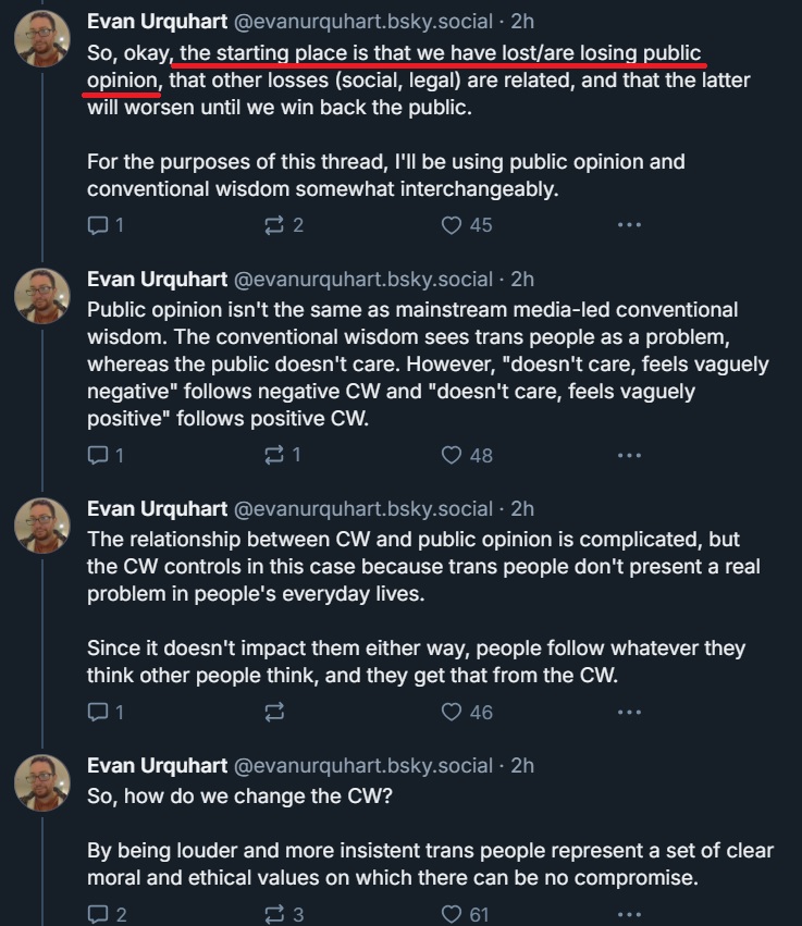 So, okay, the starting place is that we have lost/are losing public opinion, that other losses (social, legal) are related, and that the latter will worsen until we win back the public. For the purposes of this thread, I'll be using public opinion and conventional wisdom somewhat interchangeably.bsky.app