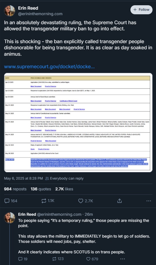 In an absolutely devastating ruling, the Supreme Court has allowed the transgender military ban to go into effect. This is shocking - the ban explicitly called transgender people dishonorable for being transgender. It is as clear as day soaked in animus...bsky.app