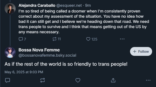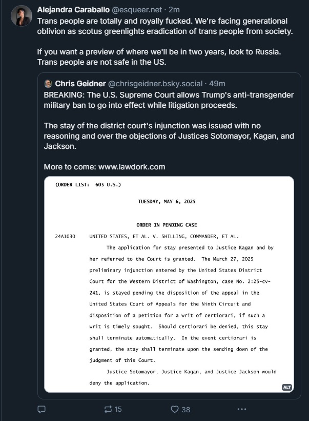 "Pretty sure this signals that we're going to lose Skrmetti as well and lose constitutional protections as a class. This will greenlight the Trump administration's efforts to purge society of trans people.", and that's what you get for grooming other people's kids online into castrating and mutilating themselves. All of this was long overdue.